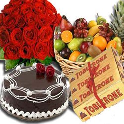 a blast of loveA bunch of fresh 12 pieces red rose, a basket of 8 items fruits, 6 pieces x 100 grams toblerone and a chocolate cake.
