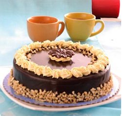 CHOCO SANSRIVALFive layers of sansrival dough filled with sweet and creamy sansrival icing, chocolate ganache and cashew nuts. The surface and sides of the cake is decorated with cashew nuts and accented with a chocolate flower topper on top center of the cake. From Goldilocks.