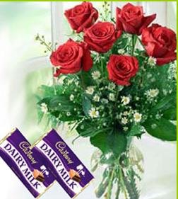6pcs Roses & cadburyHaft dozen red roses in a vase w/ 2x75 grams. A nice gift when you fall in love with someone but don't know what to offer her.Your gift will come with a greeting card and your message