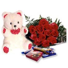 blind love with12 red roses bunch , 8" teddy ,5 Cadbury chocolates (40 grm each)