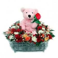 MISS U 2Basket Arrangement of 24 mix colour roses with 9" teddy bear