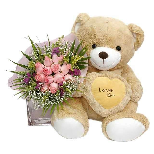 PEACHY INFATUATIONYoung and sweet, this sitting 24" light brown bear expresses newfound infatuation by arming himself with a bunch of 12 peach roses with love u pillow . pillow color may vary.
