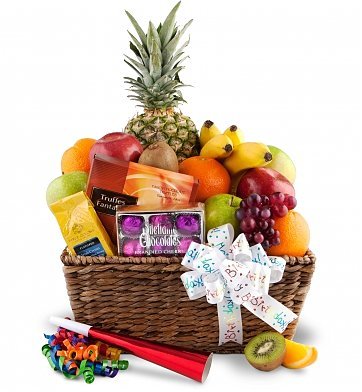 Happy Father's day Fruit BasketDecorated for the occasion, this fun basket is loaded with the finest available local and tropical fruits such as oranges, apples, bananas, pears, and grapes. Delicious treats like chocolates, crackers, cheese, and more round out this festive assortment. Ribbon, party horns, and other flourishes decorate the basket, as available. fruits ( 5 items). Exact basket and included products may vary by season and delivery location.