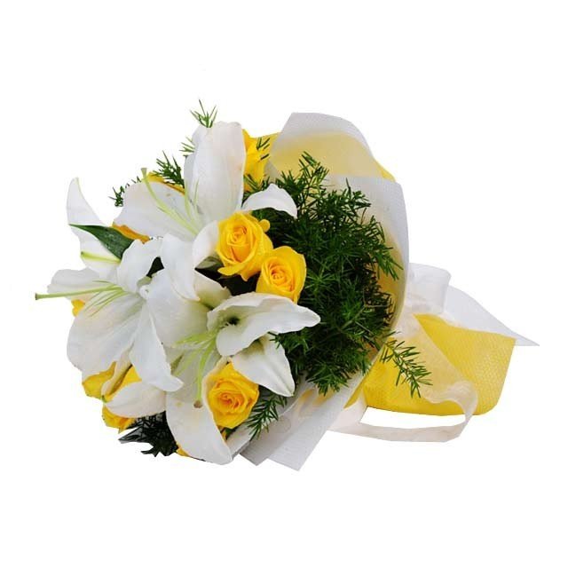 LOVELY LOVEYou cannot go wrong when you match white lilies with yellow roses for a hand bouquet. They really complement each other well.
