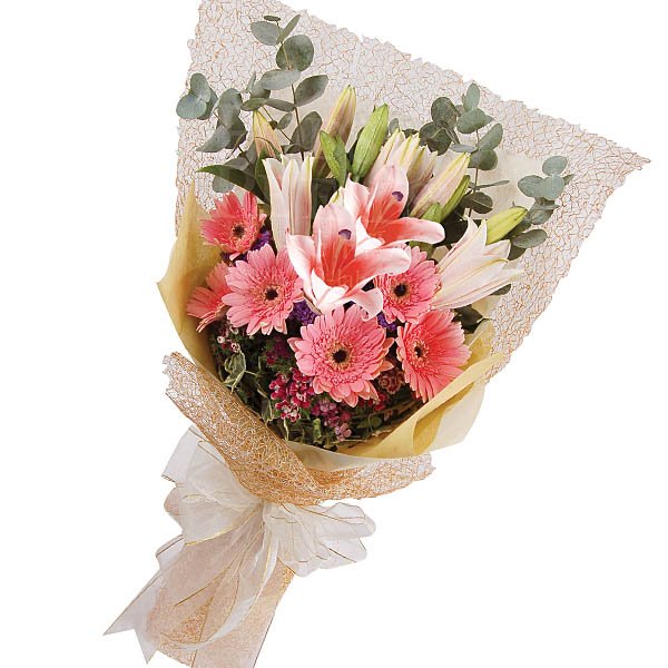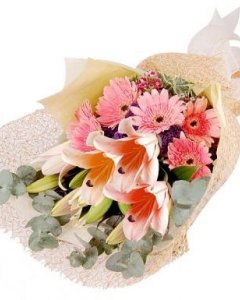 Missing DayFusion of Lilies, Holland Daisies and Eucaplytus to make her day. Picture shown is 3 Stalks of Stargazer Lilies and 6 Stalks of Gerberas / Holland Daisies.