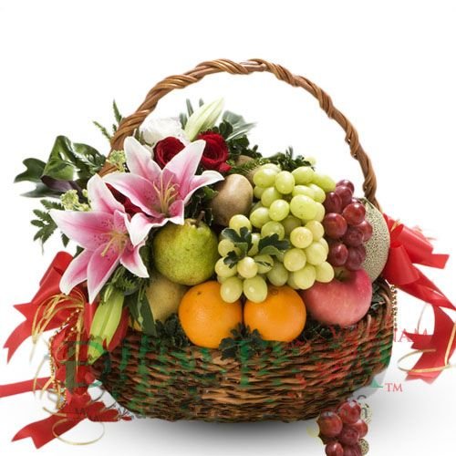 Basket of fruit for MOMOranges, apples and bananas complete this basket of flowers with the juicy, citrus sweetness they bring out. Fruits Arrangement (6 item) and stargaizer,gerbera in a basket.