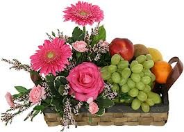 Fruit basket for momDescription: Gerbera with carnation and rose 6 pcs pink comes with assorted fresh fruit including apples, oranges and grapes,pears, banana,mango in a basket With Flower Arrangement (6 items fruits)