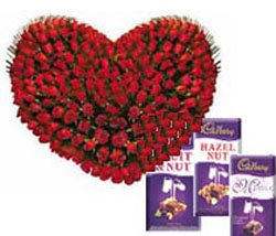 Heart & Cadbury for Your Love...Send across your love in the form of these beautiful heart shape 36 red roses and cadbury(3 x 65gm) chocolate, to let your sweetheart know how much you care !