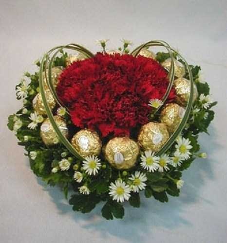 Sweet love16 ferrero ,white Malaysian and res carnation in a heart basket.
