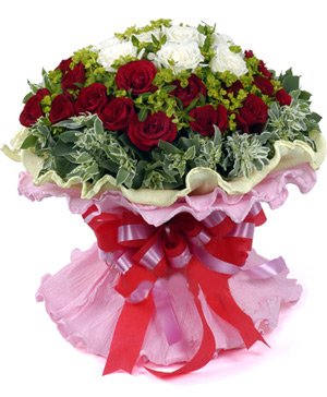 Endless Love9 white roses in the middle, 24 red roses outside. with full euphorbia marginata outside. Yellow and pink curling round paper packaging, red and pink color bowknot. Imagine your recipient's surprise when this beautiful roses in assorted pastel colors arrive at their doorstep!