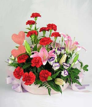 Flowes For Mother Basket12 red carnations, 1 stalks pink perfume lily, match balloonflowers, match green leaves, 2 pink paper hearts, flowers basket. (The picture is only for reference and the main items are the same, the effect is guaranteed.)