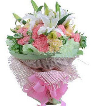 More Blissful2 White lilies, 19 pink carnations with grean leaves. Light blue paper and pink gauze wrapped, pink ribbon.