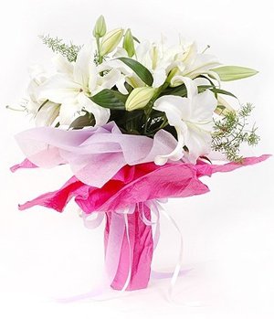 Moving Feeling5 stalks white perfume lilies, with fillers decorate and tissue paper paper packed bouquet.