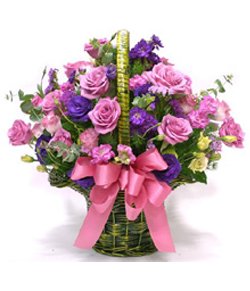Purple Lucky12 purple roses(if this color is not available we will use pink roses to instead), 8 purple carnations, 5 pink carnations, match greenery, arranged in a small basket, pink ribbon. - Order two days ahead. The picture is only for reference and the main items are the same, the effect are guaranteed.