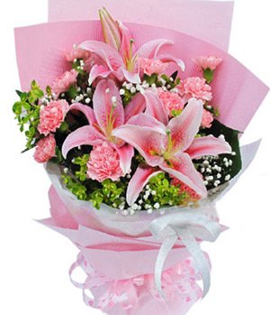 Sunshine & Sweetness2 pink perfume lilies, 11 pink carnations, baby's breath and foliages. Pink crepe paper, glass paper fan-shaped packed and pink ribbon.