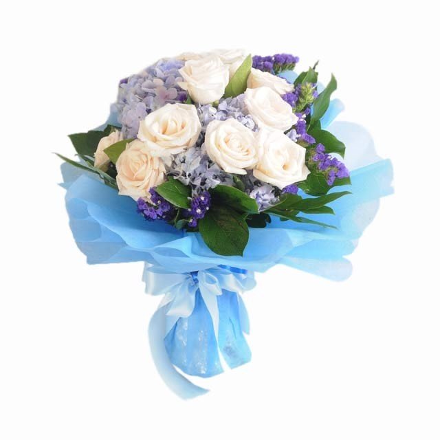 THE CRYSTAL FAIRA bouquet of White Roses (12 stalks), Blue Hydrangea (3 stalks), Purple Eustomas & Ruscus